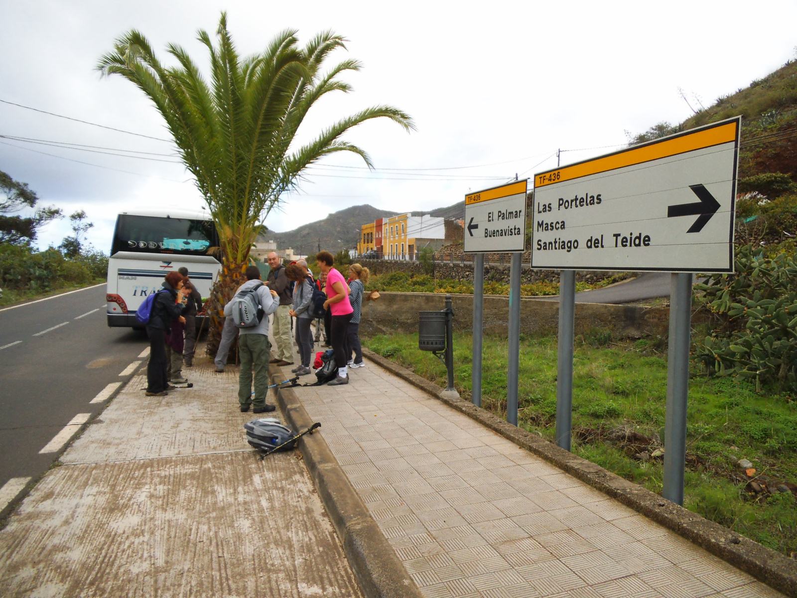 A las 8 de la mañana, como es habitual, nos reunimos los participantes frente al edificio del Centro Cultural de Los Cristianos (Arona), donde después del saludo, en mi caso el reencuentro con algunas personas, compañeros de senderos anteriores a los que hacía tiempo que no veía, nos trasladamos en la guagua hasta Santiago del Teide, donde realizamos una paradita para disfrutar de un café en la agradable compañía de los participantes, unos 18, la mayoría canarios menos una compañera de nacionalidad italiana y el que suscribe.