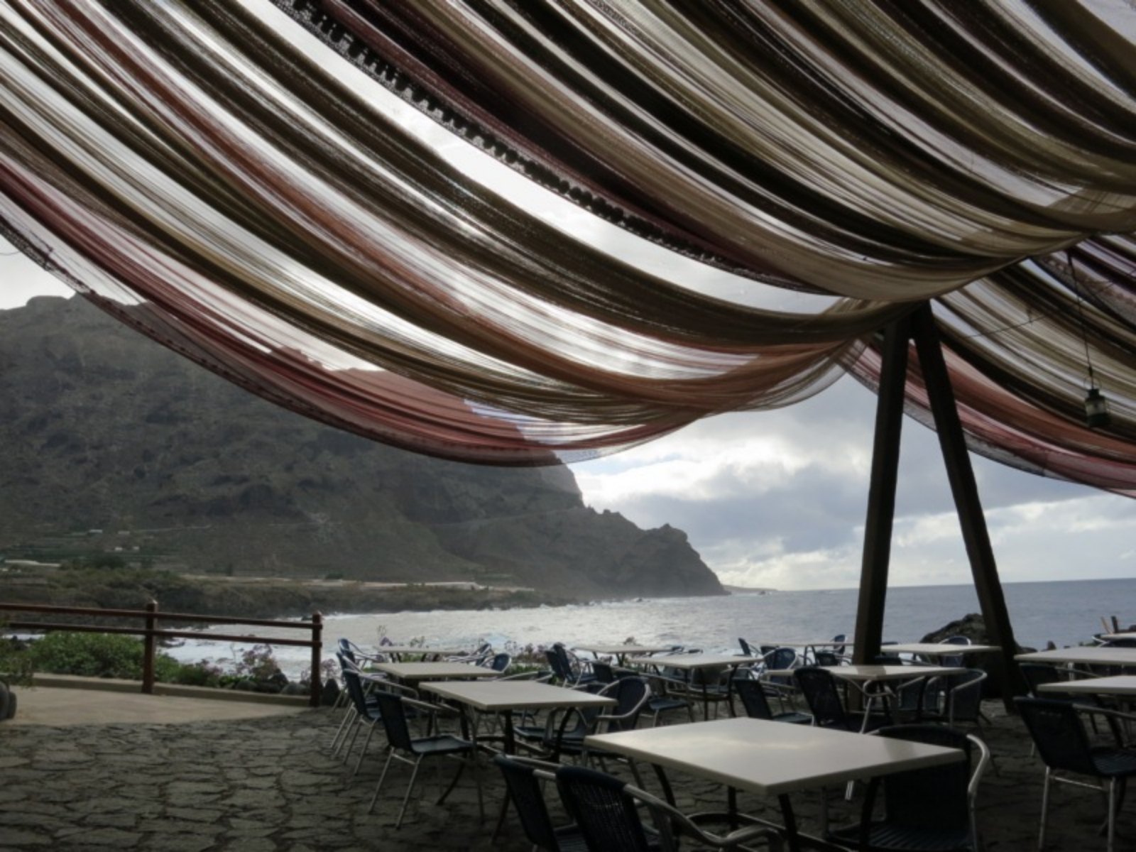 Continuamos ruta descendiendo hasta el mirador de La Tabaiba, para continuar por una prologando pendiente que discurre entre bosques de laurisilva de la época terciaria, ganado siempre altura, desde donde al fondo se divisaba la pintoresca población y el barranco de Masca. Alrededor de las 3 de la tarde por fin vimos aparecer una antigua era que el guía José Pedro nos había anunciado, pero que en algún momento pensé que era broma y ésta no llegaba nunca. En la era resguardados por unos matorrales del viento cargado de niebla húmeda y fría del alisios, con alguna fatiga algunos, conseguimos llevarnos un bocado de nuestra mochila a la boca y tratar con ello de reponer algo nuestras ya mermadas fuerzas para afrontar la continuación del último tramo de ascenso de la ruta, hasta el paraje La Cruz de Gala, desde donde ya se divisaba Santiago del Teide.