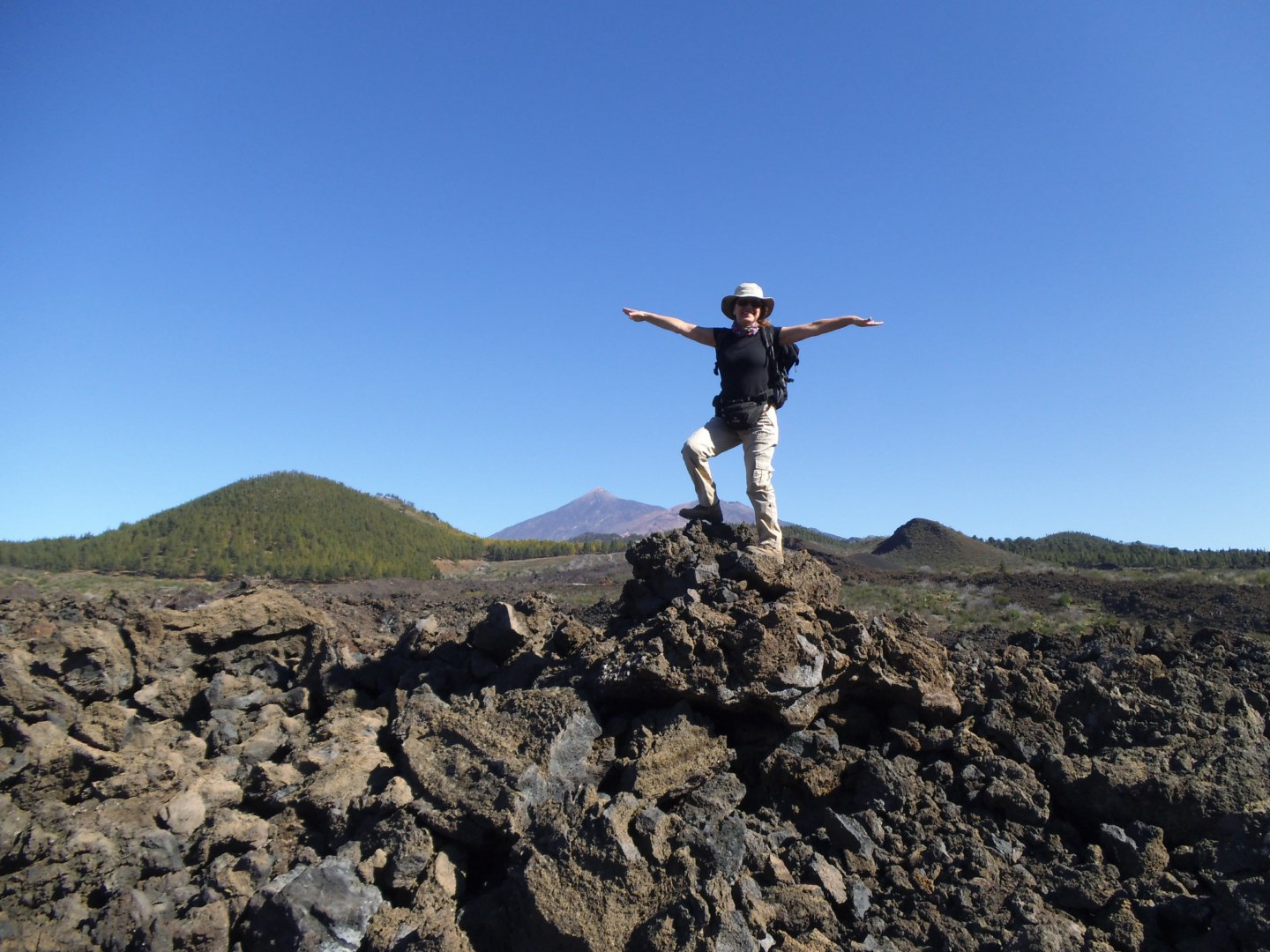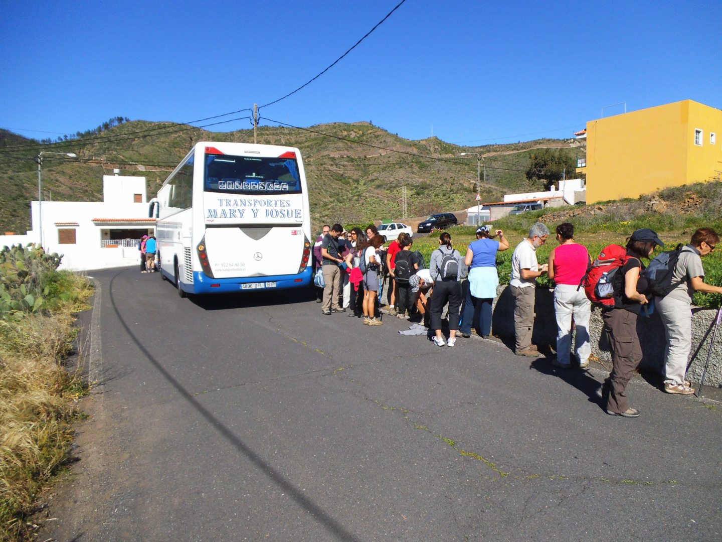 La jornada se presentaba perfecta con un tiempo espléndido, la armonía del grupo y la cara de los participantes reflejaba y expresaba el buen momento que estábamos disfrutando, con esta sensación y tras múltiples paradas para admirar el paisaje, hacer fotografías, comer y descansar un poco de la fatiga, llegamos hasta el cruce con la atarjea de Vergara, en las inmediaciones del cono del Chinyero, para tomar el camino de descenso, paso a paso, caminando por un paisaje volcánico espectacular entre conos y coladas de lava en las que ya comienza a aparecer la primera forma de vida vegetal con la población y el arraigo de los líquenes, hasta que alrededor de las 5 de la tarde terminamos en la pequeña aldea de Las Manchas donde nos recogió el autobús para trasladarnos de nuevo hasta Santiago del Teide y terminar la ruta en la terraza de un establecimiento hostelero, disfrutando de una buena jarra de cerveza.