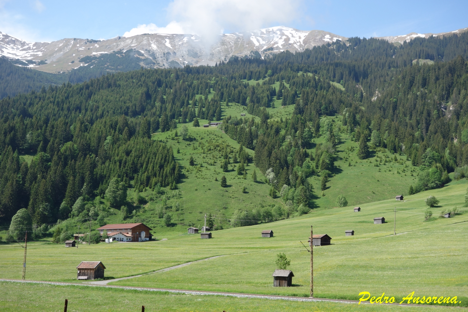 Os cuento esto, porque en la primera parte del viaje de hoy, hemos vivido y disfrutado de nuevo de esta sensación. La ruta, con la inestimable ayuda de nuestros medios de navegación, nos lleva y nos hace disfrutar de tres paisajes diferentes. En primer lugar, viajamos por el paisaje alpino, rodeados de altas montañas con grandes bosques en la parte baja de estas y zonas lacustres en los valles. Continuando el viaje, dejando atrás las impresionantes montañas de los Alpes, para paulatinamente adentrarnos en el paisaje prealpino de suaves y verdes colinas y campos, donde predomina el paisaje integrado de pequeños pueblos o casas de explotaciones ganaderas dispersas. En estas zonas prealpinas por las que viajamos, la belleza del paisaje, se acentúa por los contrastes de color que nos ofrecen la abundante floración de la zona, en contrate con el verde de sus campos y el gris de las carcabas terrosas que con abundancia y espontaneidad asoman en el paisaje.