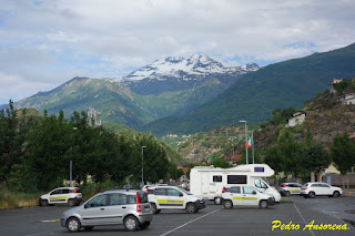 Con esas impresiones continuamos viaje poco a poco, percibiendo como el cielo en la proximidad otra vez de los Alpes, comenzó a nublarse. Superamos la circunvalación de Turín, en una hora donde había mucho trafico, continuando ruta hacia los ya presentes Alpes, hacia la frontera de Sestriere, aquí ya con la presencia de la bienvenida lluvia y el tiempo mas fresco, ideal para descansar. Así que como ya era buena hora, decidimos finalizar la jornada en la población de Susa ,en plenos Alpes, en su área de autocaravanas. N-45º8’19’’ E-7º3’14’’.